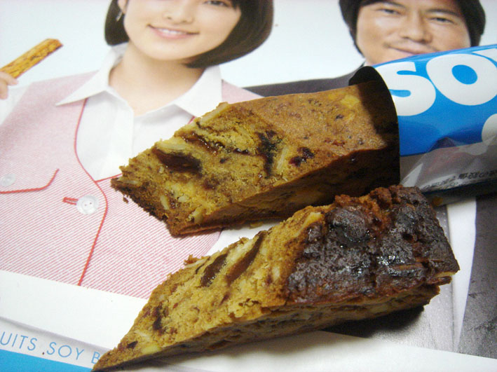 封をきって・・・しげしげと見た感じ、よくあるスティック状のフルーツケーキのよう。見えているプルーンやレーズンが食をそそります。でも表面が焼けすぎ?裏か表かわからないけど・・・ちょっと黒いね。
